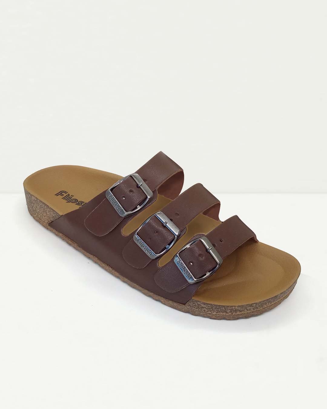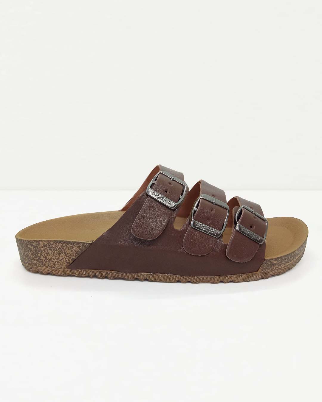 Flipside Levi Three Buckle Sandals for Men has an adjustable closure with faux leather crossing toe-ring straps and buckled vamp strap for a secure fit. The molded contoured cork footbed ensures lasting arch foot support.